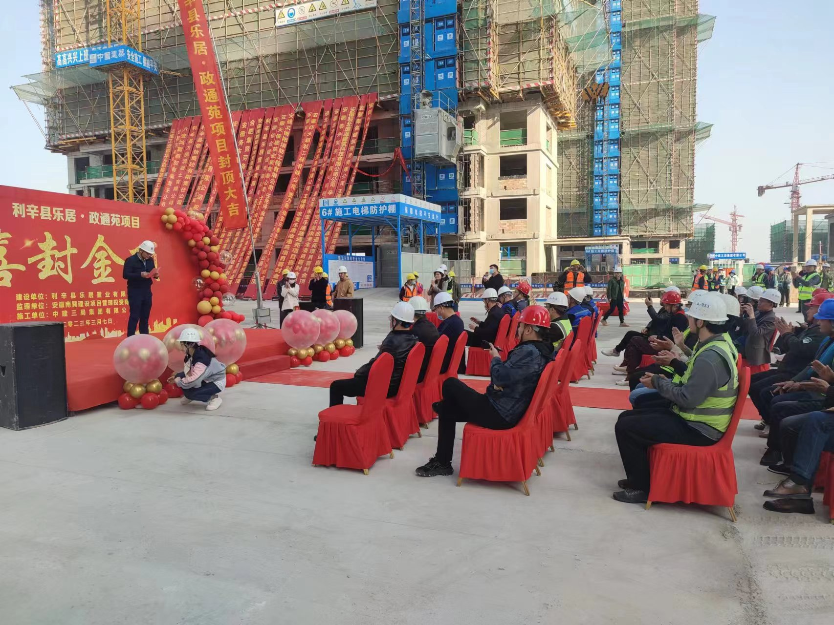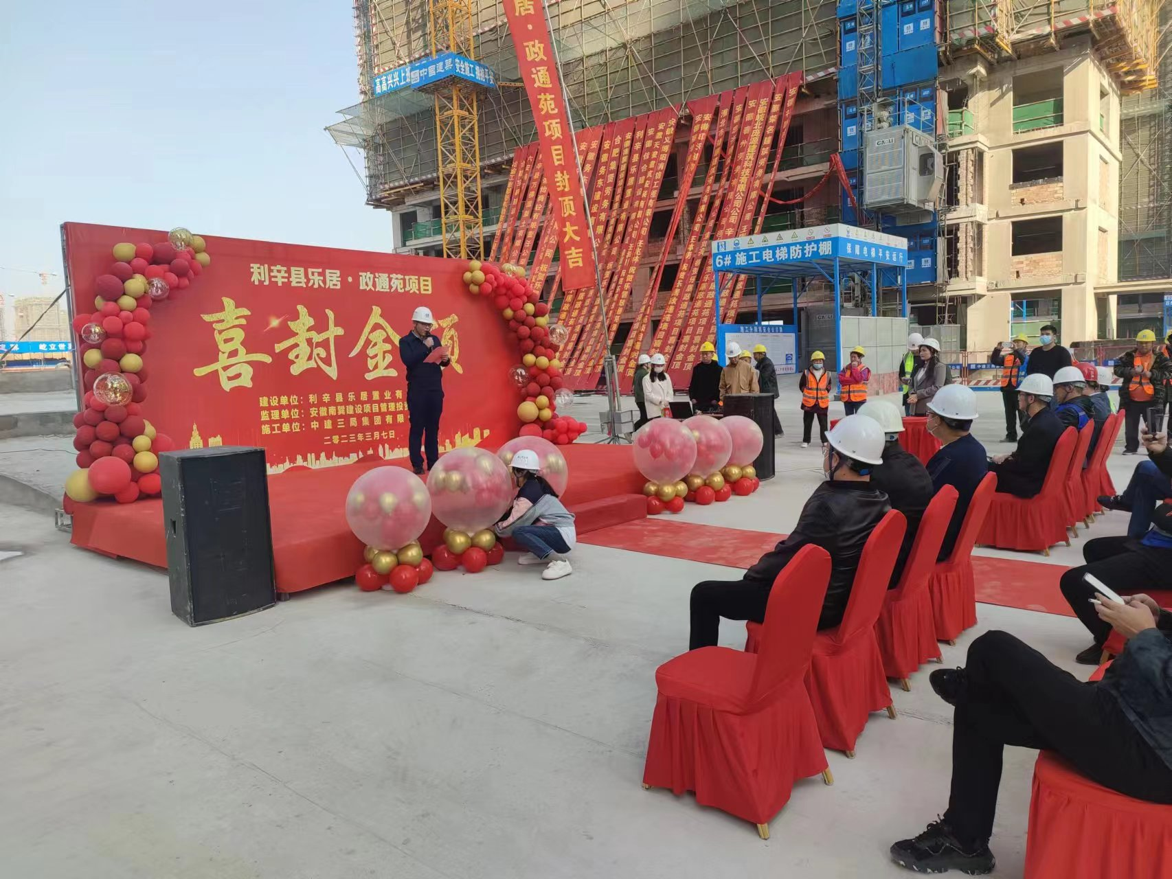 上午10点政通苑封顶仪式正式拉开帷幕,尚居副总经理许寅生、工程部副经理刘传强、政通苑施工方项目经理李闯等参加封顶仪式,并分别上台致辞,共同见证这一荣耀时刻。