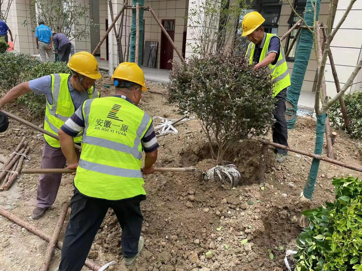 自8月初进场施工以来,一原公司派专人驻场监督绿化施工,积极推进知行学校小学部绿化施工。为克服前期高温天气带来的不利影响,特制定专项栽植方案,采取疏枝、疏叶、为树木输营养液和加大浇水频次等有效措施,降低高温天气对苗木的影响。