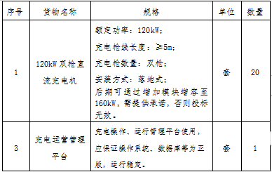 2、招标内容:120kW双枪直流充电桩20台(后期可通过增加模块增容至160kW,需提供承诺,否则投标无效),总控制价940000元,包含充电运营管理平台(免费)、供货、包装运输及保险、装卸、安装(含辅件)、考核验收、培训、交付后约定期限内免费维修保养服务、同时需无偿配合后期充电桩迁移安装调试等全部内容,质保期:5年,自验收合格之日起计算。