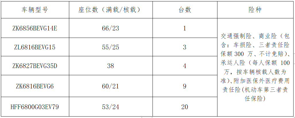 2、招标内容及服务要求:险种为交通强制险、商业险(包含:车损险、三者责任险保额 300 万、不计免赔)、承运人险(每人保额 100 万,按车辆满载人数为准)、附加医保外医疗费用责任险(机动车第三者责任保险)。本次保险采购共有 5 个车型,分别是:
