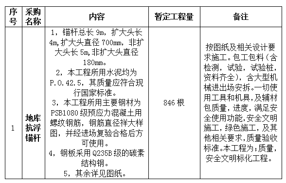 2、招标内容:抗浮锚杆专业承包,包工包料,含所有辅材、耗材、机械、机具及人工等。