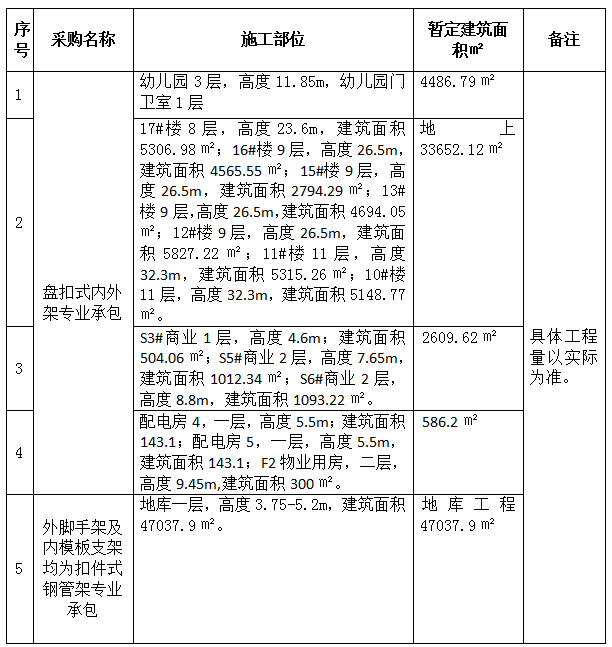 2、招标内容:脚手架及模板支架专业承包,包工包料,内供外搭,及所有辅材(油漆、稀释剂、预埋安装、钢丝绳等)、耗材、机械机具及人工由乙方提供。