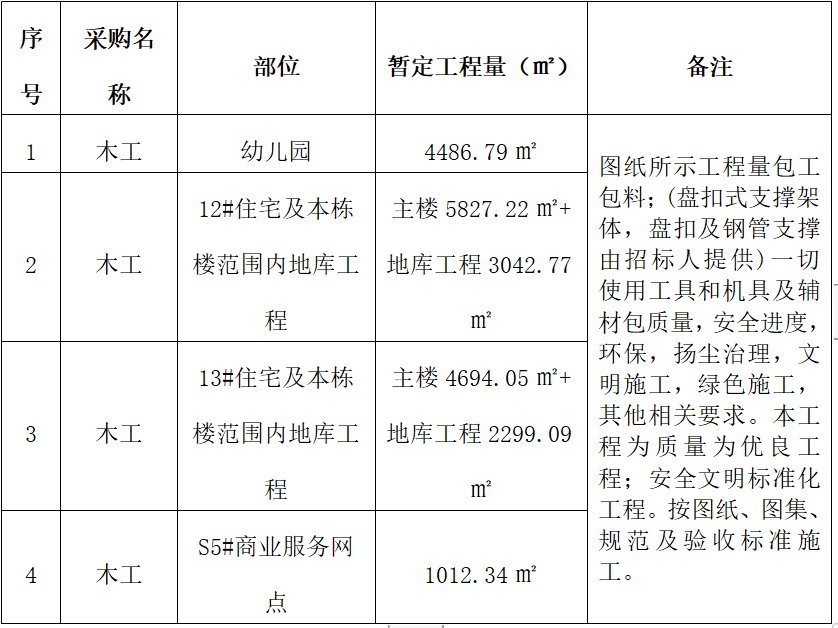 2、招标内容:幼儿园三层建筑面积4486.79㎡、12#号楼9层建筑面积5827.22㎡、13#号楼9层建筑面积4694.05㎡、s5商业2层建筑面积1012.34㎡。按施工图纸内所有全部木工工作内容。